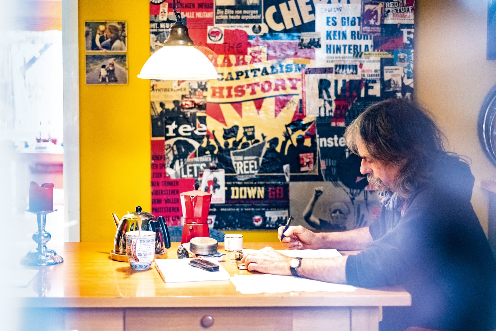 Wir sitzen in der Küche und duzen uns sofort. Alte Schwarz-Weiß- Fotos von Wolfram Hänel, seiner Frau Ulrike Gerold und ihrer kleinen Tochter hängen an den Küchenschränken. Die Lust auf Gestalten dringt aus jeder Pore. Wie Hänel hier Tag für Tag sitzt und auf seinem Klemmbrett Geschichten erfindet, in Worte kleidet, mit einem Stift auf dem Papier festhält, kann ich mir sofort vorstellen. Er und seine Frau haben mehr als 120 Bücher veröffentlicht – Kinder- und Jugendbücher, Hannover-Krimis, Skandinavien-Thriller. Einige davon haben sie zusammen verfasst.
